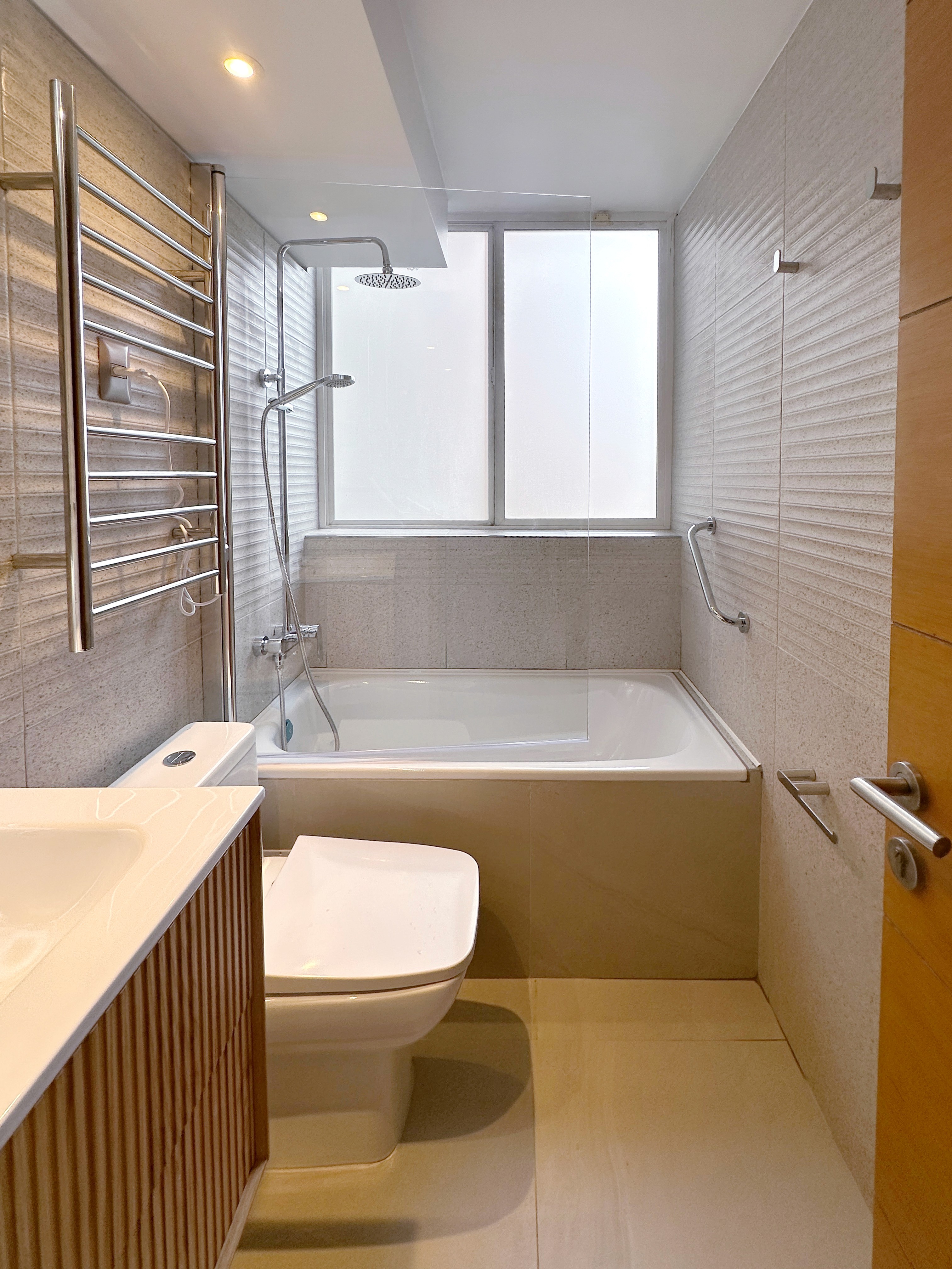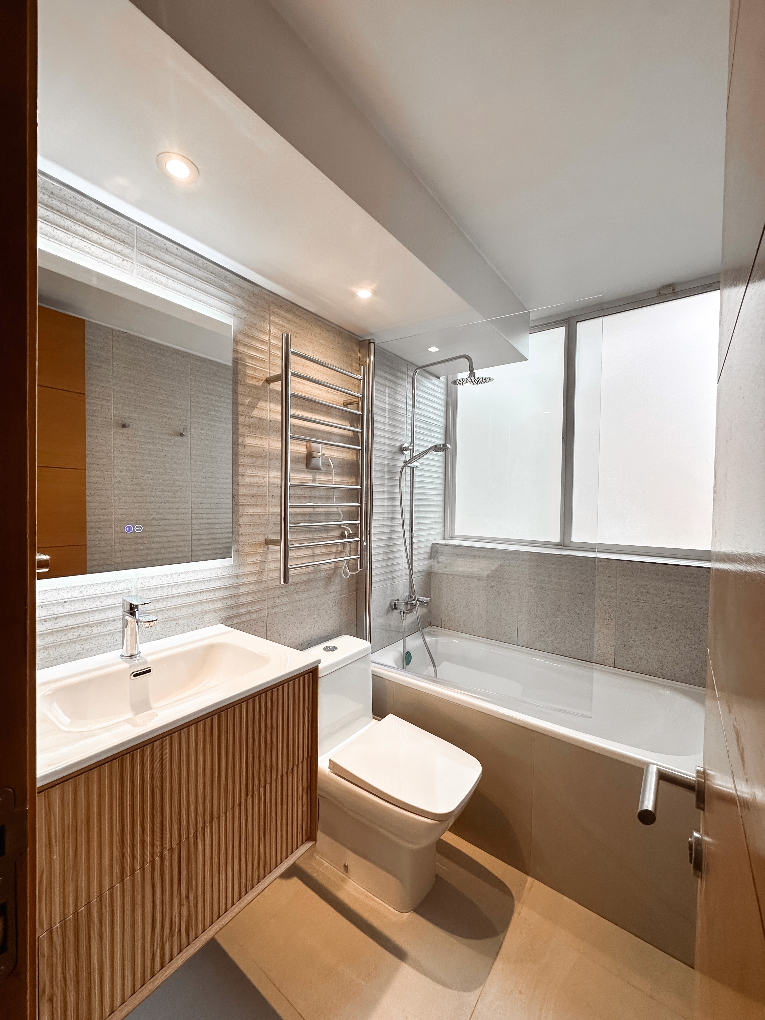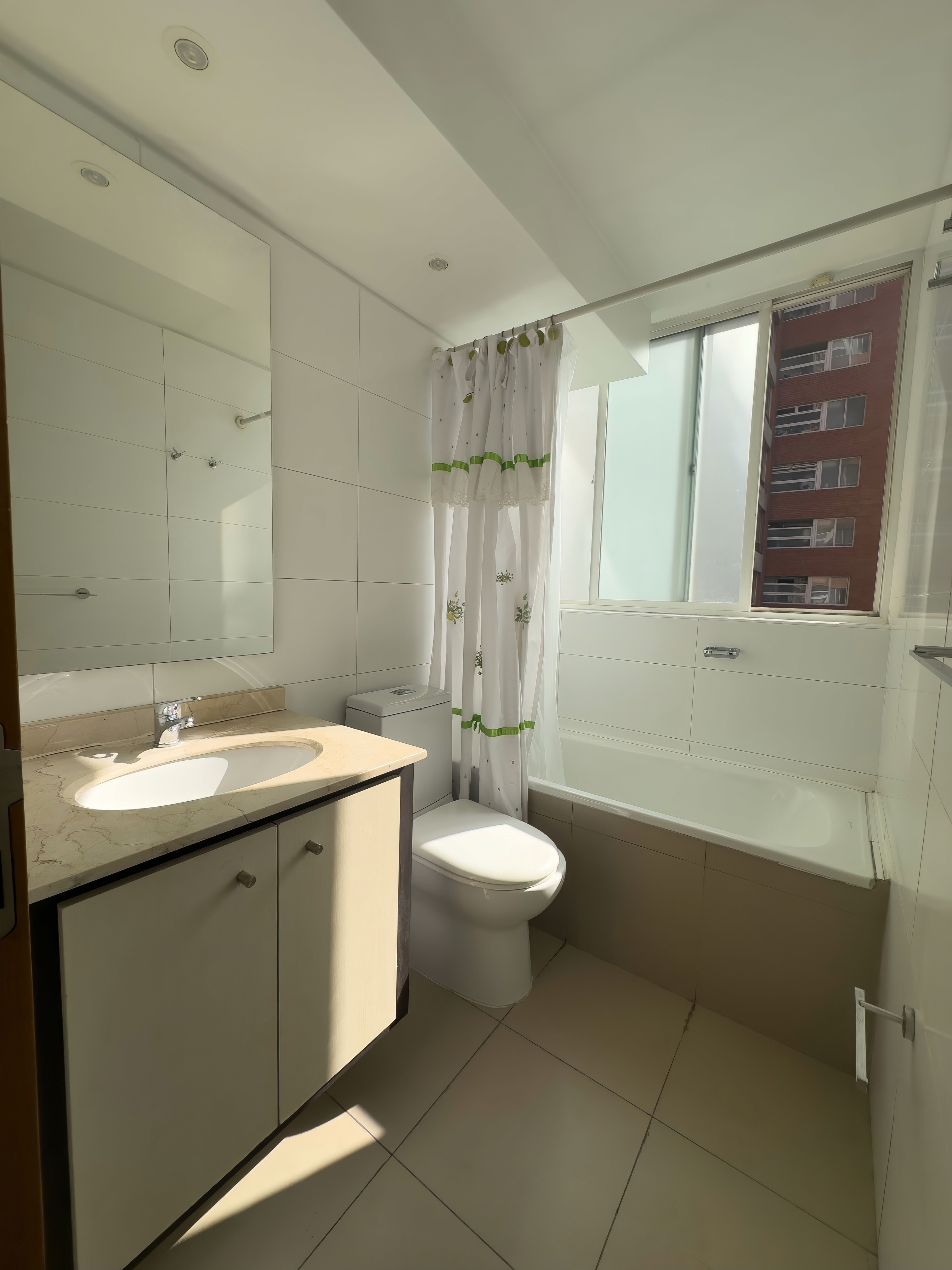 Revestimiento completo en piso y muros WC onepiece con mecanismo incluido Vanitorio suspendido con grifería monomando Espejo retroiluminado y seca toallas Pintura de cielo Accesorios nuevos (toallero, papelero, jabonera) Demolición total y retiro de escombros